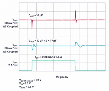 圖2.LT3072的單輸出超快瞬態(tài)響應(yīng)顯示只需使用10 µF (1 µF + 2.2 µF + 6.8 µF)輸出電容即可實現(xiàn)微秒建立時間。中間的跡線顯示可使用額外的電容來限制偏移振幅,但建立時間略長。