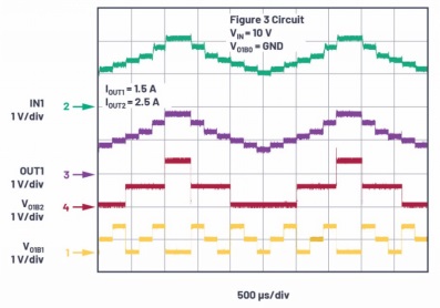 圖4.圖3所示電路的動態(tài)測試。跡線顯示,通過軟件對三態(tài)引腳VO1B2和VO1B1(VO1B0接地)進行更改如何實現(xiàn)對LT3072的OUT1電壓調(diào)整。反過來,LT3072動態(tài)控制LT8616通道1輸出,該輸出對LDO穩(wěn)壓器的IN1輸入進行預(yù)調(diào)節(jié)。這樣,LDO穩(wěn)壓器的IN1電壓保持在一個高于LDO穩(wěn)壓器OUT1的固定壓差,從而可實現(xiàn)高效率和高負載瞬變性能,所有這一切無需對硬件進行任何更改。
