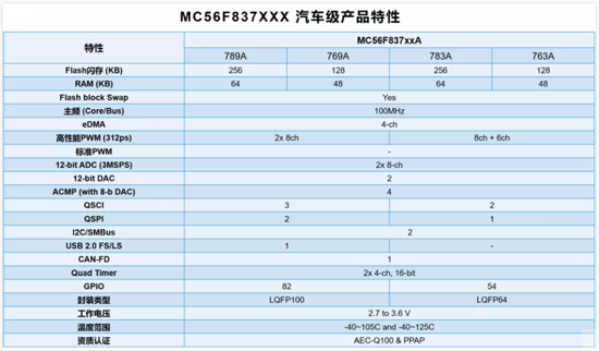 56F83xxx系列新增8個(gè)汽車(chē)級(jí)產(chǎn)品, 命名為56F837xxA系列。56F837xxA系列通過(guò)了AEC-Q100第一級(jí)和第二級(jí)的安全認(rèn)證,對(duì)應(yīng)的工作溫度范圍為第二級(jí):-40~105°C;第一級(jí):-40~125°C。具體產(chǎn)品組合如下圖: