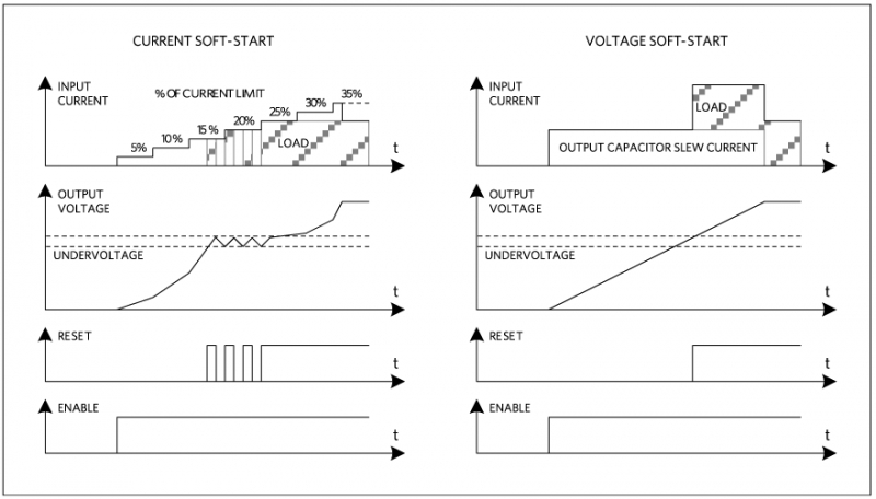 種方法是電流軟啟動。大多數(shù)穩(wěn)壓器具有電流限值;電流軟啟動是緩升或步進到該電流限值。由于輸出電容充電量遠遠小于   負載電流,軟啟動使得輸出電壓緩慢上升。電流軟啟動的優(yōu)點是穩(wěn)壓器輸入電流穩(wěn)定上升,不會將負載啟動的瞬態(tài)電流傳遞到輸入。