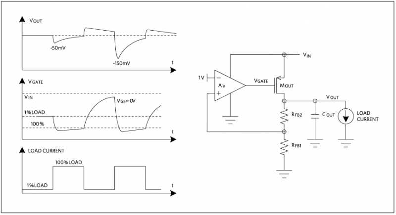 負載快速變化期間,多數(shù)穩(wěn)壓器都具備一定的能力使輸出保持在穩(wěn)壓范圍內(nèi)。負載變化時,輸出 FET 柵極驅動需要隨之變化。而柵極驅動達到新水平所需的時間決定了輸出電壓的瞬態(tài)下沖或過沖。