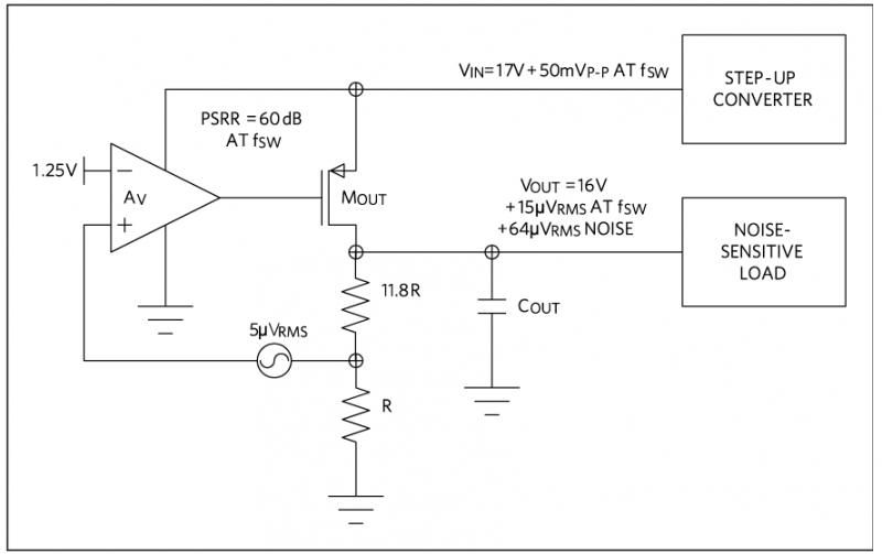 對于較高的輸出電壓,線性穩(wěn)壓器的輸出噪聲可能成為 PSRR 的決定因素。這是因為分壓后的反饋輸入噪聲增大了。假如一個線性穩(wěn)壓器將噪聲較高的升壓轉換器的 17V 輸出轉換為噪聲較小的 16V 電源,紋波小于 100uV。開關頻率處的 PSRR 為 60dB,50mVP-P 升壓轉換器紋波將衰減到 50uVP-P,或者輸出噪聲 15uVRMS。如果采用 5uVRMS 低噪聲基準和反饋運放輸入,我們來看一下反饋輸入產(chǎn)生的問題。如果反饋輸入調(diào)整在 1.25V,電阻反饋網(wǎng)絡將輸出設置為 16V,那么輸出噪聲將增大到 5uVRMS x (16V/1.25V),即 64uVRMS,這可能成為主要的噪聲源。(圖 5)顯示了高壓輸出造成的輸出噪聲性能下降。