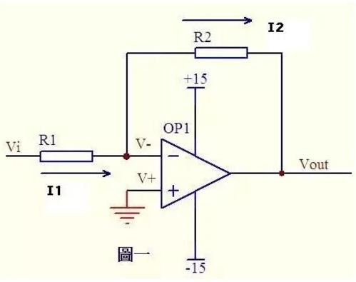 圖一運(yùn)放的同向端接地=0V,反向端和同向端虛短,所以也是0V,反向輸入端輸入電阻很高,虛斷,幾乎沒(méi)有電流注入和流出,那么R1和R2相當(dāng)于是串聯(lián)的,流過(guò)一個(gè)串聯(lián)電路中的每一只組件的電流是相同的,即流過(guò)R1的電流和流過(guò)R2的電流是相同的。流過(guò)R1的電流I1=(Vi-V-)/R1……a流過(guò)R2的電流I2=(V--Vout)/R2……bV-=V+=0……cI1=I2……d求解上面的初中代數(shù)方程得Vout=(-R2/R1)*Vi這就是傳說(shuō)中的反向放大器的輸入輸出關(guān)系式了。