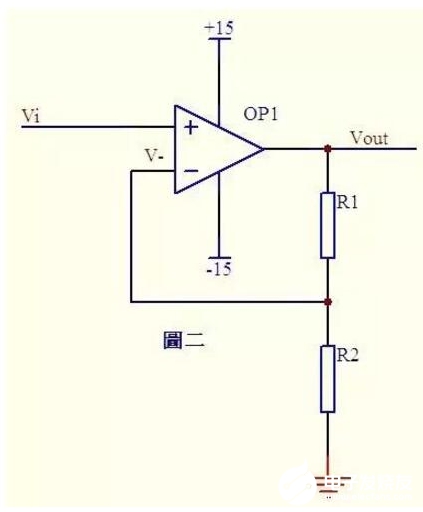 圖二中Vi與V-虛短,則Vi=V-……a因?yàn)樘摂,反向輸入端沒(méi)有電流輸入輸出,通過(guò)R1和R2的電流相等,設(shè)此電流為I,由歐姆定律得:I=Vout/(R1+R2)……bVi等于R2上的分壓,即:Vi=I*R2……c由abc式得。Vout=Vi*(R1+R2)/R2這就是傳說(shuō)中的同向放大器的公式了。