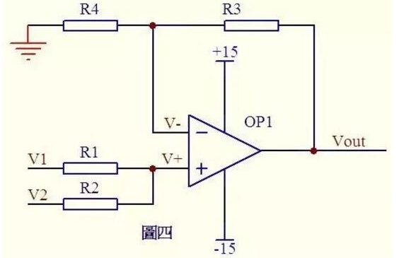 圖四。因?yàn)樘摂啵\(yùn)放同向端沒(méi)有電流流過(guò),則流過(guò)R1和R2的電流相等,同理流過(guò)R4和R3的電流也相等。故(V1–V+)/R1=(V+-V2)/R2……a(Vout–V-)/R3=V-/R4……b由虛短知:V+=V-……c如果R1=R2,R3=R4,則由以上式子可以推導(dǎo)出V+=(V1+V2)/2V-=Vout/2故Vout=V1+V2也是一個(gè)加法器。