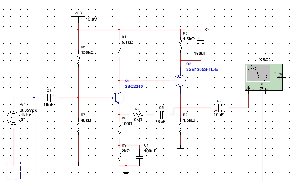 假設Tr1的發(fā)射級電流1mA,則可以求得發(fā)射級電阻的值,在設計過程中,為了滿足使用條件,應該盡量增加第一級電路的放大倍數來提高開環(huán)增益,但是增加增益的條件是增加及集電極電阻Rc的值,但Rc的值太大,使得Tr2的集電極的電位過于接近GND,導致不能輸出最大的電壓。這里取集電極的壓降為5V,理論上可以輸出10Vp-p。