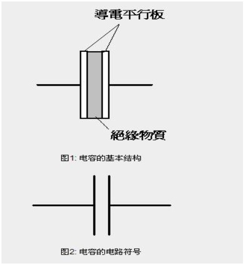 電容是一種以電場(chǎng)形式儲(chǔ)存能量的無(wú)源器件。在有需要的時(shí)候,電容能夠把儲(chǔ)存的能量釋出至電路。電容由兩塊導(dǎo)電的平行板構(gòu)成,在板之間填充上絕緣物質(zhì)或介電物質(zhì)。圖1和圖2分別是電容的基本結(jié)構(gòu)和符號(hào)。