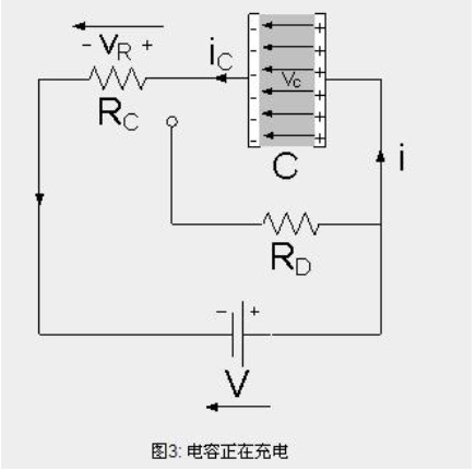若電容與直流電源相接,見(jiàn)圖3,電路中有電流流通。兩塊板會(huì)分別獲得數(shù)量相等的相反電荷,此時(shí)電容正在充電,其兩端的電位差vc逐漸增大。一旦電容兩端電壓vc增大至與電源電壓V相等時(shí),vc = V,電容充電完畢,電路中再?zèng)]有電流流動(dòng),而電容的充電過(guò)程完成。