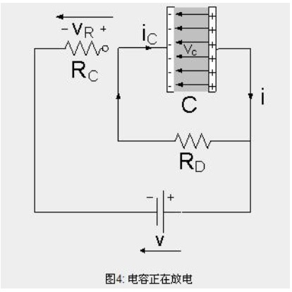 當(dāng)切斷電容和電源的連接后,電容通過(guò)電阻RD進(jìn)行放電,兩塊板之間的電壓將會(huì)逐漸下降為零,vc = 0,見(jiàn)圖4。