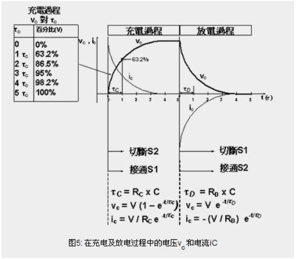 電阻值R和電容值C的乘積被稱為時(shí)間常數(shù)τ,這個(gè)常數(shù)描述電容的充電和放電速度,見(jiàn)圖5。