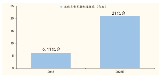 根據(jù) IHS的數(shù)據(jù)顯示,2018 年無線充電發(fā)射端、接收端出貨量達(dá) 6.11 億臺,預(yù)計到2023年,無線充電發(fā)射端、 接收端的出貨量將達(dá)21億臺,五年CAGR(復(fù)合年均增長率)將達(dá) 28%。