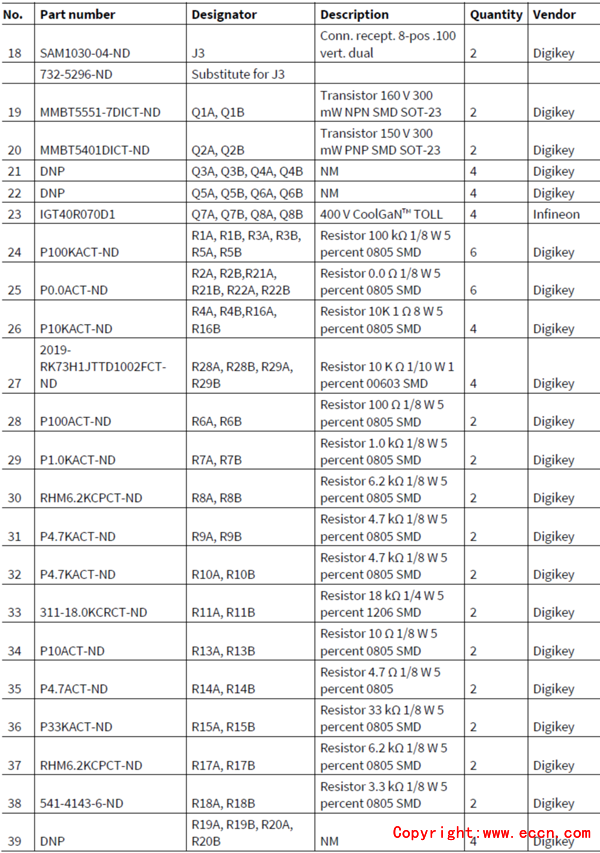 infineon公司的IGT40R070D1 E8220是400V Cool增強(qiáng)模式氮化鎵高遷移率晶體管(GaN HEMT).該器件通過(guò)在體二極管的零反向恢復(fù)電荷和非常小的線性輸入和輸出電容,克服了技術(shù)阻擋層如線性和功率損耗.CoolGaN™由于具有低/線性Coss,零Qrr和常開開關(guān),理想的D類音頻放大器提供0%失真和100%效率.D類放大器線性和功率損耗是高度依賴于開關(guān)器件的開關(guān)特性. Infineon公司的CoolGaN™通過(guò)引入體二極管的零反向恢復(fù)電荷和非常小的線性輸入和輸出電容,打破了這種技術(shù)壁壘.此外,增強(qiáng)模式提供了快速開合和關(guān)斷速度,以及在單個(gè)芯片或封裝內(nèi)更好的集成通路.這種特性使得CoolGaN™和IRS20957SPBF D類控制器配對(duì)時(shí)更簡(jiǎn)便,能是客戶更快的設(shè)計(jì)和更早走向市場(chǎng).本文介紹了IGT40R070D1 E8220主要特性,電感負(fù)載開關(guān)時(shí)間測(cè)試電路以及采用IRS20957SPBF + IGT40R070D1 E8220評(píng)估板EVAL_AUDAMP24主要特性,主板和子板電路圖,材料清單和PCB設(shè)計(jì)圖.