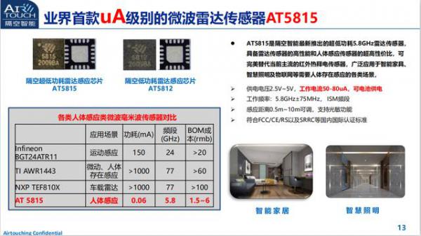 隔空智能CEO林水洋表示,隔空智能的微波雷達傳感器AT5815的功耗僅0.06mA,遠低于與國外的英飛凌、TI、NXP等大廠的毫米波雷達傳感器,并且成本也更低,只有1.5-6人民幣。當然,在精度上卻是要比國外的毫米波雷達傳感器要差,但是應用于人體感應已經足夠,非常適合于智能家居、智慧照明、智慧安防等場景。