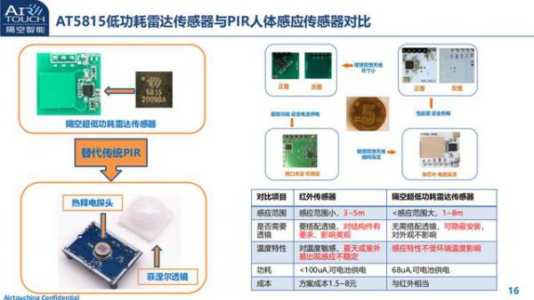 根據(jù)隔空智能公布AT5815低功耗雷達傳感器與POR人體感應傳感器對比數(shù)據(jù)來看,AT5815的感應范圍更大,且無需搭配透鏡,可隱藏安裝,感應特性不受環(huán)境溫度影響,功耗也更低,成本與紅外相當。林水洋表示AT5815可以很好的替代PIR人體感應傳感器。