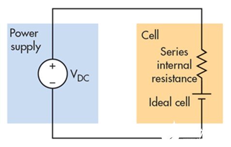 來(lái)看看測(cè)試環(huán)境(圖 2)。這是一個(gè)很簡(jiǎn)單的測(cè)試環(huán)境,電源與需要充電的電池相連。常將電池視作含有串聯(lián)內(nèi)阻的理想電池?墒褂脤(zhuān)用電池測(cè)試設(shè)備或LCR 表通過(guò)交流電阻(ACR)測(cè)量獲得內(nèi)部電阻值。