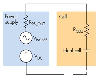 電池充電電源輸出端存在電壓噪聲。量程10 V的電源輸出噪聲為10 mV峰峰值是很普遍的。圖 3 描繪了電池和電源的簡(jiǎn)單模型,標(biāo)明了阻抗和噪聲源。頻率低于 100 Hz 時(shí),RPS_OUT 趨近 0 Ω。電源的輸出電壓噪聲表現(xiàn)為與直流輸出串聯(lián)的交流電壓源。該交流電壓(即噪聲)又表現(xiàn)為通過(guò)電池內(nèi)部較低阻值的串聯(lián)電阻的交流電流,根據(jù)歐姆定律:INOISE = VNOISE / (RPS_OUT + RCELL)。