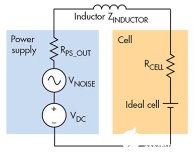 另一種方法是將電感器與電池串聯(lián)(圖 4)。電感在低頻下阻抗較低,高頻下阻抗較高。根據(jù)歐姆定律,得到 INOISE = VNOISE/(ZPS_OUT + ZINDUCTOR + ZCELL),隨著頻率提高,ZINDUCTOR 逐漸增大,成為分母中的最大值。因此,隨著頻率升高,電流噪聲(INOISE)逐漸降低。