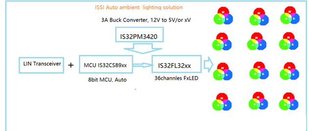 如下圖Lumissil驅(qū)動多路RGB氛圍燈系統(tǒng)所示,系統(tǒng)采用汽車級高壓3ABuck恒壓驅(qū)動芯片IS32PM3420提供5V電源電壓,采用汽車級MCU IS32CS89xx 控制各種燈效LED驅(qū)動芯片來驅(qū)動多顆 RGBLED (多達(dá)12或6顆RGB),從而使整體系統(tǒng)成本將大大降低,而且也只占用一個LIN地址。