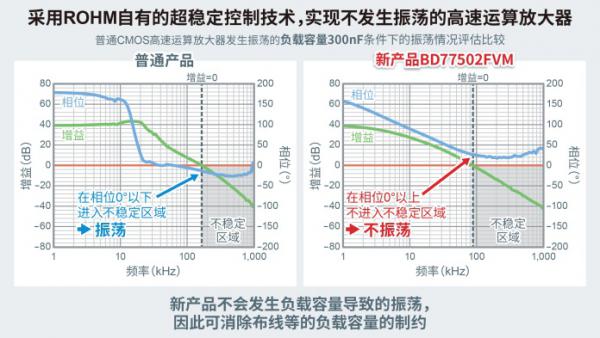新產(chǎn)品采用ROHM自有的電源技術(shù)“Nano Cap™”,實(shí)現(xiàn)了非常穩(wěn)定的控制,不僅支持異常檢測系統(tǒng)等所要求的高速放大(轉(zhuǎn)換速率高達(dá)10V/µs),而且是不會因布線等的負(fù)載容量而發(fā)生振蕩的運(yùn)算放大器。普通的高速運(yùn)算放大器會因布線等的負(fù)載容量而變得不穩(wěn)定,而且受布線和外圍部件的限制非常難以處理。而本產(chǎn)品可在不發(fā)生振蕩的狀態(tài)下穩(wěn)定工作,非常有助于縮減應(yīng)用的設(shè)計工時。