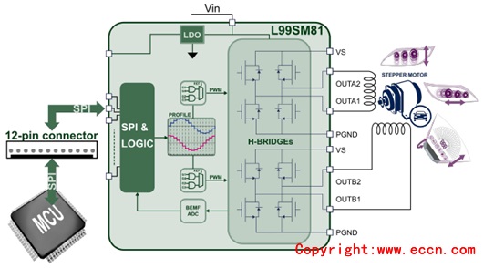 ST公司的L99SM81V是汽車(chē)級(jí)的綜合驅(qū)動(dòng)器,用于雙極兩相步進(jìn)馬達(dá),該馬達(dá)具有可編幅度的電流控制微步進(jìn)功能.器件具有5V電壓穩(wěn)壓器以便給外接傳感器供電.L99SM81V集成的串行外設(shè)接口(SPI)使得可調(diào)整器件參數(shù),控制所有的工作模式和讀出診斷信息.數(shù)字I/O也可選擇以用于更靈活和更可靠的應(yīng)用控制.器件滿(mǎn)足AEC-Q100資質(zhì),步進(jìn)馬達(dá)驅(qū)動(dòng)器電流高達(dá)1.35A,可編程的步進(jìn)模式包括全步進(jìn),半步進(jìn),迷你步進(jìn),1/8微步進(jìn),1/16微步進(jìn).電流調(diào)整回路有等效的10位分辨率.器件具有兩個(gè)4位可編滿(mǎn)刻度電流放大:一個(gè)用于RUN,另一個(gè)用于HOLD模式.6為DAC用于基準(zhǔn)電流產(chǎn)生.PWM頻率搖擺可降低EM能量.器件具有輸出保護(hù)和診斷(開(kāi)路負(fù)載,對(duì)電池短路和對(duì)地短路),集成的ADC用于線圈電壓檢測(cè)和失速檢測(cè),5V低壓降穩(wěn)壓器用于短路保護(hù),待機(jī)模式具有非常低的電流消耗(典型值為10 μA).熱告警和關(guān)斷功能.主要用在汽車(chē)電子的雙極2相步進(jìn)馬達(dá)驅(qū)動(dòng)器如自適應(yīng)前燈系統(tǒng)或平視顯示器投映儀.本文介紹了L99SM81V主要特性,框圖,步進(jìn)馬達(dá)驅(qū)動(dòng)器應(yīng)用框圖和評(píng)估板AEK-MOT-SM81M1主要特性,步進(jìn)馬達(dá)應(yīng)用框圖,電路圖,材料清單.