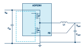 圖2.帶有線(xiàn)圈安放位置的ADP2360降壓轉(zhuǎn)換器的示例電路。