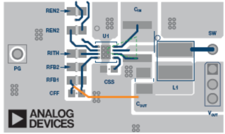 圖2所示為ADP2360的示例布局。在本圖中,圖1中的重要熱回路標(biāo)為綠色。從圖中可見(jiàn),黃色反饋路徑離線(xiàn)圈L1有一定距離。它位于PCB的內(nèi)層。