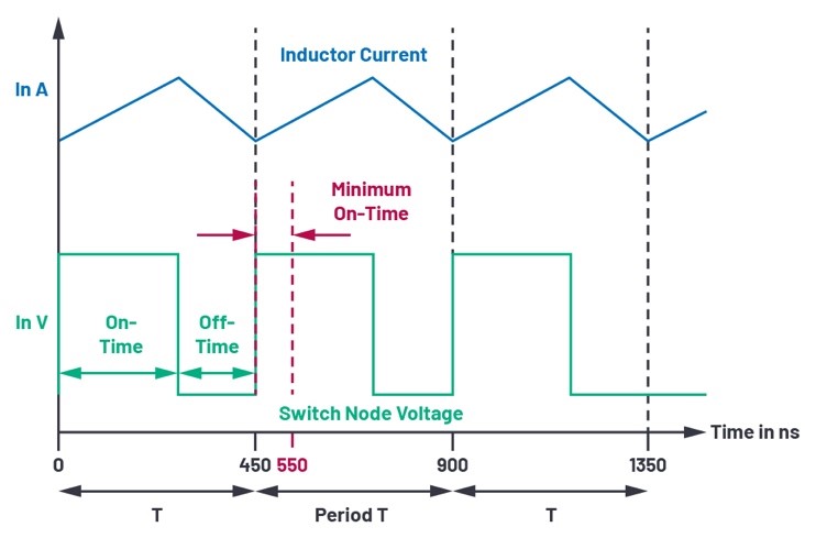 對于低占空比,例如降壓型開關穩(wěn)壓器中的高輸入電壓和低輸出電壓,最小導通時間是關鍵限制。它通常會限制支持開關模式電源工作的最大開關頻率。