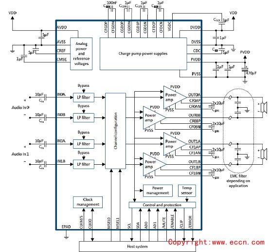 Highly flexible output stage configurations are offered,ranging from four single-ended outputs to a singleparallel-BTL output.