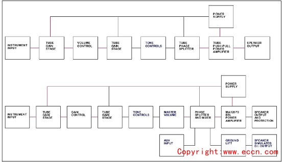 圖3.經(jīng)典美國電子管貝斯放大器(上)和MA12070貝斯放大器(下)拓撲圖