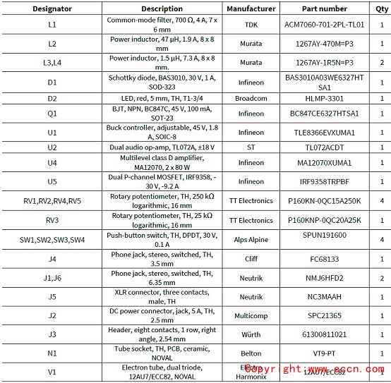 MA12070樂器貝斯放大器材料清單: