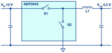 在負(fù)載點(POL)降壓轉(zhuǎn)換器領(lǐng)域,同步變化的高邊和低邊有源開關(guān)已被廣泛使用。圖1顯示了具有理想開關(guān)的此類電路。與使用無源肖特基二極管作為低邊開關(guān)的架構(gòu)相比,此類開關(guān)穩(wěn)壓器具有多項優(yōu)勢。主要優(yōu)勢是電壓轉(zhuǎn)換效率更高,因為與采用無源二極管的情況相比,低端開關(guān)承載電流時的壓降更低。