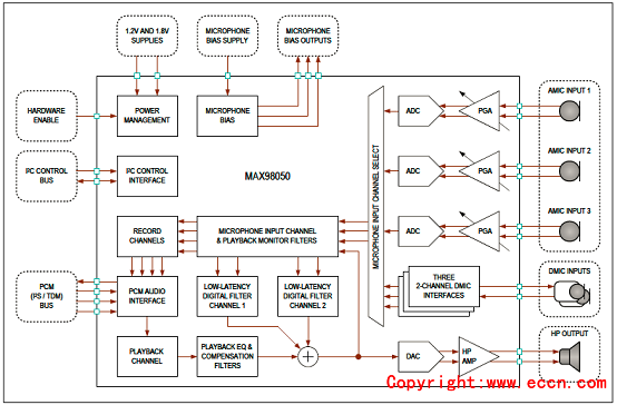 圖3.MAX98050 PCM輸入和輸出音頻數(shù)據(jù)通路圖