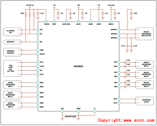 Maxim公司的MAX98050是集成了低等待數(shù)字濾波器的低功耗高性能音頻CODEC.器件具有單通路播放通路,具有5波段雙二階均衡器和高效率全差分混合AB類/D類耳機(jī)放大器.播放耳機(jī)放大器優(yōu)化以得到極低輸出噪音電平和最小化靜態(tài)功耗,從而最大化輸出功率效率.器件包括三個(gè)麥克風(fēng)輸入通路,支持聲音,環(huán)境和抗噪音錄音使用.每個(gè)通路能單獨(dú)從外接模擬或數(shù)字麥克風(fēng)進(jìn)行錄音,并能把音頻數(shù)據(jù)送到錄音通路(到數(shù)字音頻接口)和外接低等待數(shù)字濾波器通路.還提供了第四個(gè)錄音通路到數(shù)字音頻接口,以允許主機(jī)監(jiān)視播放通路輸出數(shù)字?jǐn)?shù)據(jù).數(shù)字濾波器通路的取樣速率96kHz/192kHz/384kHz可選擇,單通路耳機(jī)播放通路具有高效的混合AB類/D類放大器,播放動(dòng)態(tài)范圍114dB,三個(gè)麥克風(fēng)錄音通路具有模擬或數(shù)字麥克風(fēng)輸入,動(dòng)態(tài)范圍107dB(AMIC單端)或113dB(AMIC差分).1% THD+N時(shí)32Ω的滿刻度播放功率為31mW(1VRMS滿刻度模式). 6.7mm2 36凸點(diǎn)WLP封裝,主要用在真無(wú)線耳機(jī)和耳塞,立體聲耳機(jī),單聲道藍(lán)牙耳塞,PSAP設(shè)備和助聽(tīng)器輔助設(shè)備,VR/AR耳機(jī)和頭帶設(shè)備.本文介紹了MAX98050主要優(yōu)勢(shì)和特性,簡(jiǎn)化和詳細(xì)框圖,PCM輸入和輸出音頻數(shù)據(jù)通路圖,PCM模式錄音和播放應(yīng)用電路圖以及評(píng)估系統(tǒng)MAX98050EVSYS#主要特性,單聲道和立體聲框圖,評(píng)估板電路圖,材料清單和PCB設(shè)計(jì)圖.