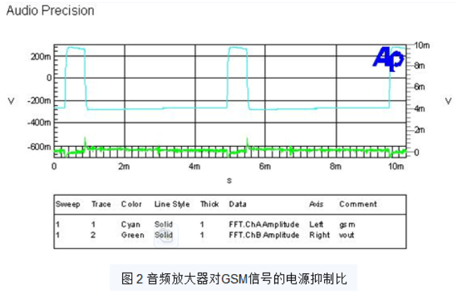 在 TDMA 和 GSM 手機中,最嚴重的電源電壓噪聲來自 RF 級的開與關。GSM 電話的開關頻率為 217Hz。當 RF 功率放大器接通時,從電源獲得高電流,這時電源下降高達 500mV。PSRR 差的音頻放大器將在揚聲器產(chǎn)生大于 217Hz 的諧波“咔咔”噪聲。圖 2為PSRR為60dB的放大器對GSM信號的抑制能力。