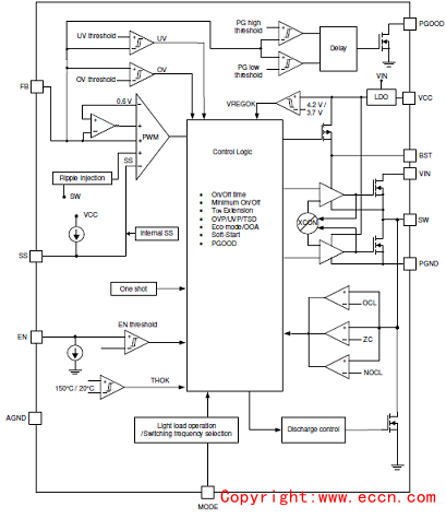 The MODE pin can be used to set Eco-mode™ orOut-of-Audio™ (OOA) mode for light-load operationand 500-kHz or 800-kHz switching frequency. TheEco-mode™ maintains high efficiency during light loadoperation. The OOA mode keeps the switching
