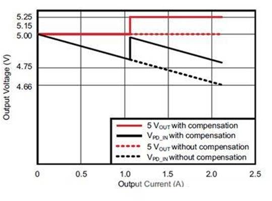 一個(gè)常見的解決方案就是盡可能地將典型值為5.0V的無負(fù)載輸出設(shè)定電壓提高到5.15V至5.20V(對(duì)于USB 3.0來說,最大值為5.25V)。這個(gè)解決方案在最大2.1A電流時(shí)提供足夠(雖然仍舊為最小值)凈空。而對(duì)于更高的負(fù)載電流,這個(gè)方法很快就會(huì)難以支撐。