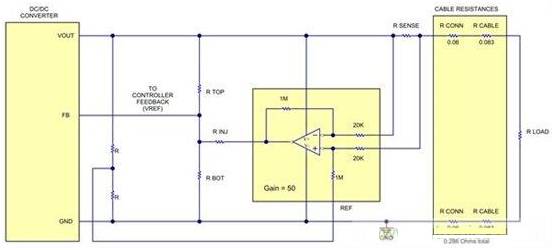 圖2中的方框圖詳細(xì)給出了一個(gè)線性增加轉(zhuǎn)換器輸出電壓,以補(bǔ)償電纜損耗,并且保持電纜末端電壓恒定的方法。這個(gè)解決方案增加了一個(gè)感測(cè)電阻器來監(jiān)視輸出電流。一個(gè)差分放大器增加感測(cè)電阻器上的電壓,并且使用這個(gè)電壓來將一個(gè)電流注入到控制器的反饋 (FB) 引腳內(nèi)。如需進(jìn)一步了解這個(gè)方法的詳細(xì)信息,請(qǐng)參見“電源技巧:補(bǔ)償電纜上的電壓下降”。