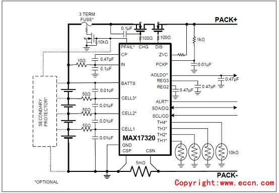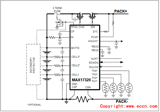 圖4.MAX17320帶保險絲的應(yīng)用電路圖