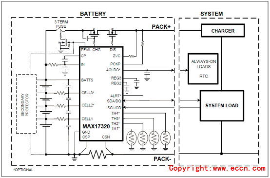 圖3.MAX17320 2S-4S電池組和系統(tǒng)實現(xiàn)圖