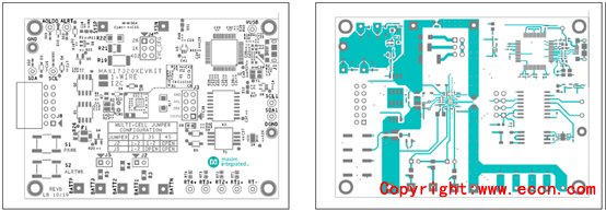 圖9.評估板MAX17320X EVK PCB設(shè)計圖:左:頂層絲印;右:頂層