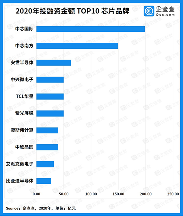 2020年,芯片半導(dǎo)體發(fā)生投融資事件458起,拿到融資的企業(yè)共計392家,總?cè)谫Y金額高達(dá)1097.69億元,最高融資金額被中芯國際拿下,合計198.5億元,由國家基金一期、國家大基金二期、上海集成電路和國家集成電路共同注資,皆為國資背景。