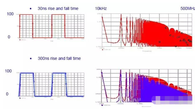 波形的斜率對干擾的高頻部分影響非常大。低頻部分幾乎沒有影響。低頻部分主要由波形的幅度和高電平部分的寬度決定的,但高頻部分大幅度下降的轉(zhuǎn)折點為1/(3.14*tr),所以tr越大時,轉(zhuǎn)折點的頻率越低,高頻下降越大。