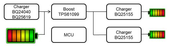 以下我們從續(xù)航的角度給大家推薦TI最新的解決方案。圖一是一個(gè)典型的TWS耳機(jī)電源框圖,用一顆Iq(靜態(tài)電流)低至600nA的升壓芯片TPS61099將電池電壓升到5V同時(shí)給兩個(gè)耳機(jī)端供電。耳機(jī)端電池電壓存在電壓差,這將降低充電效率。