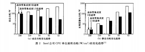 隨著工藝節(jié)點(diǎn)的進(jìn)步,靜態(tài)功耗的重要性逐漸顯現(xiàn)。從英特爾和IBM的芯片工藝發(fā)展中可以看出,在工藝制程從180nm到45nm的演進(jìn)過(guò)程中,晶體管集成度增速不同,動(dòng)態(tài)功耗或增加或減少,但靜態(tài)功耗一直呈上升趨勢(shì), 45nm時(shí),靜態(tài)功耗幾乎與動(dòng)態(tài)功耗持平。