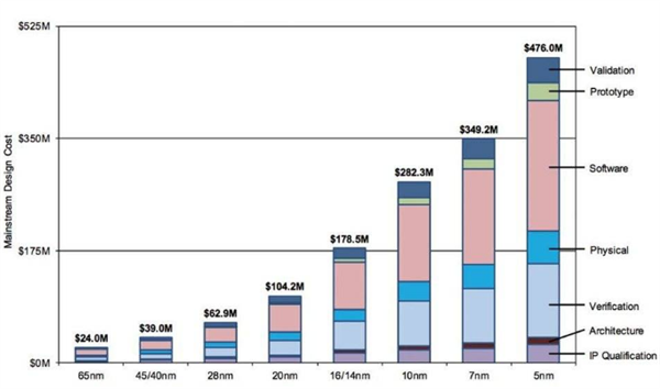 根據(jù)市場(chǎng)研究機(jī)構(gòu)International Business Strategies (IBS)給出的數(shù)據(jù)顯示,65nm 工藝時(shí)的設(shè)計(jì)成本只需要0.24億美元,到了28nm工藝時(shí)需要0.629億美元,7nm和5nm成本急速增長(zhǎng),5nm設(shè)計(jì)成本達(dá)到4.76億美元。