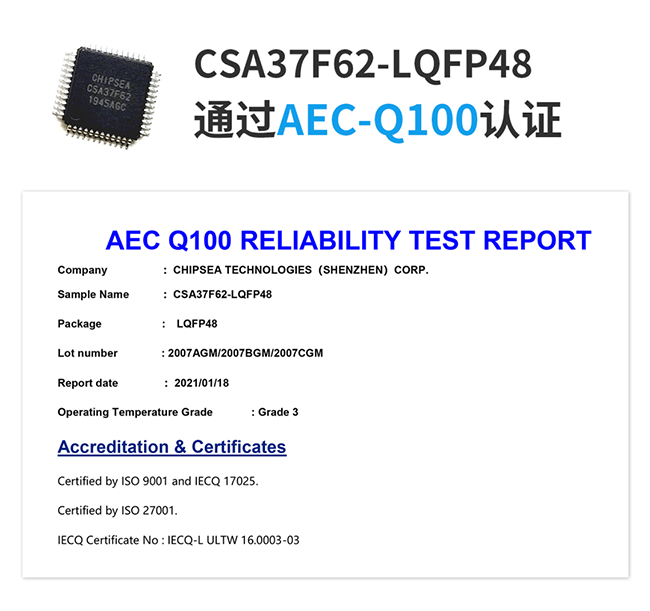 近日,芯?萍际讉汽車電子項目CSA37F62-LQFP48成功通過AEC-Q100權威認證。