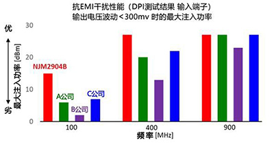 NJM2904B / NJM2902B 是遵照國標(biāo)IEC 62132-4※3以及JEITA標(biāo)準(zhǔn)ED-5008※4的適當(dāng)基準(zhǔn),進行了產(chǎn)品比較和測試,確定獲得了業(yè)界頂級水準(zhǔn)的抗干擾性能,在新品研發(fā)設(shè)計和探討更換部件時,您可放心使用此款運算放大器。
