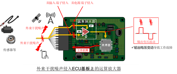 汽車ECU上使用的運算放大器當(dāng)受到超出工作頻率的外來電磁波噪聲(EMI)干擾,輸出電壓就會產(chǎn)生波動,這將造成ECU出現(xiàn)工作故障。