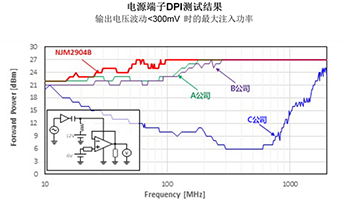 新日本無線徹底分析了運算放大器內(nèi)部各部分電路的EMI侵入路徑和對電路工作的影響以及出現(xiàn)故障的機理,對各部分電路實施了最佳的EMI抗干擾對策。于是,不光對輸入端子,對電源端子的抗EMI干擾性能也成功的提高到了業(yè)界頂級水準(zhǔn)。
