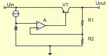 取樣電壓Uin加在比較器A的同相輸入端,與加在反相輸入端的基準(zhǔn)電壓Uref(Uout*R2/(R1+R2))相比較,兩者的差值經(jīng)放大器A放大后.Uout=(U+-U-)*A注A為比較放大器的倍數(shù),)控制串聯(lián)調(diào)整管的壓降,從而穩(wěn)定輸出電壓。